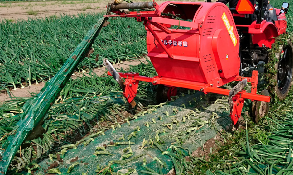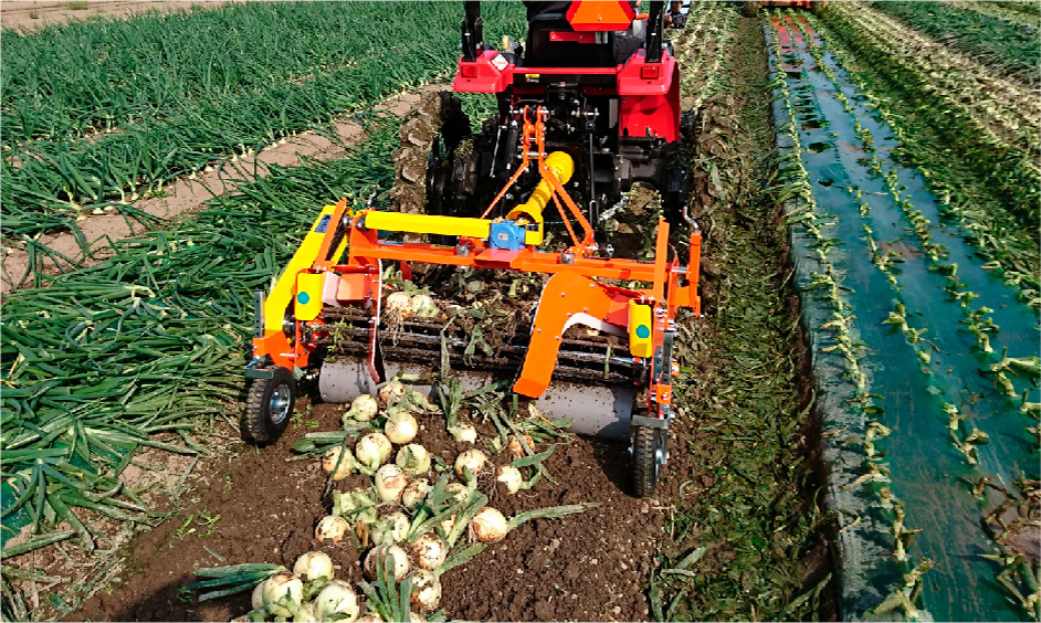 タマネギ専用の堀取り機です。タマネギを掘り上げて、コンベアで後方に送りながら土を落とします。拾い集めなどの後作業も楽にできます。
