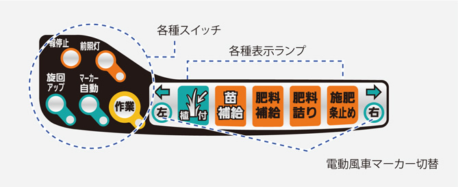 マーカー操作や旋回アップの入り切りも手元で行え、作業が楽です。