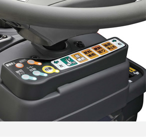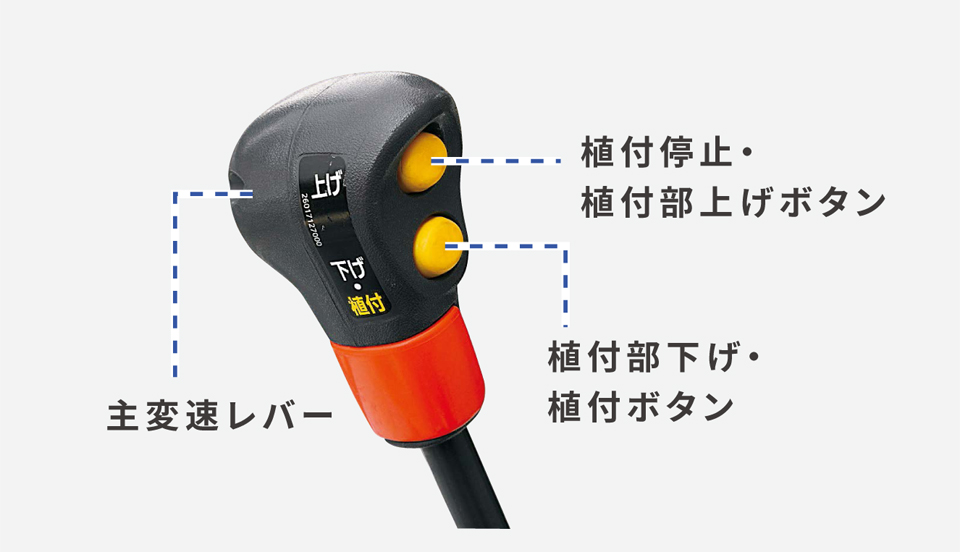 主変速レバーに「植付停止・植付部上げボタン」「植付部下げ・植付ボタン」を装備。