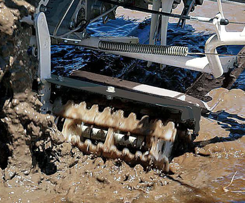 水抜けがよいカゴ型形状をちどり配置し、きれいに整地します。ロータ回転は車速連動で、安定してならします。