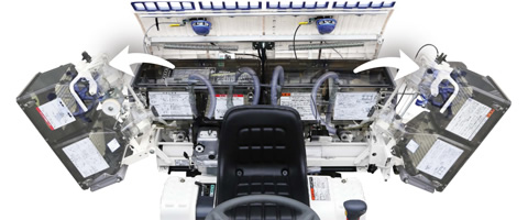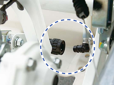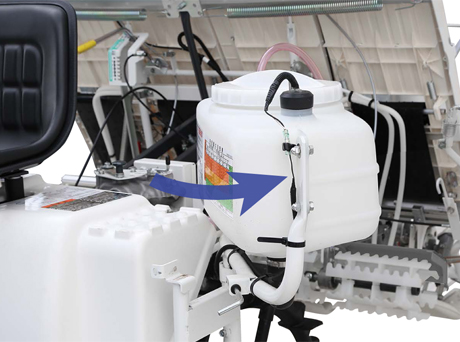 タンクは大型の補給口で肥料補給が楽。またワンタッチで45°開閉でき、乗降の邪魔になりません。