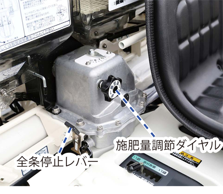 施肥量はダイヤル操作だけで簡単調節。また全条停止レバーで、ブロアと施肥駆動をワンタッチで停止できます。