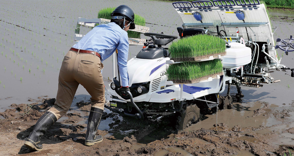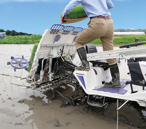 AZハンドル・ワイドステップ・サポートフレームなど安全機能が充実。ほ場の出入りや苗継ぎ等不安定になりやすい場面でも、安心して作業が行えます。