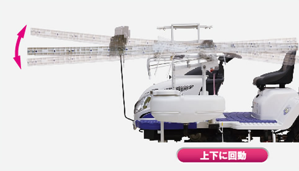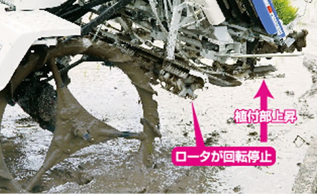 まくらっこ駆動中に植付部を上昇させると、ロータが自動停止。下降させると自動で回転します。