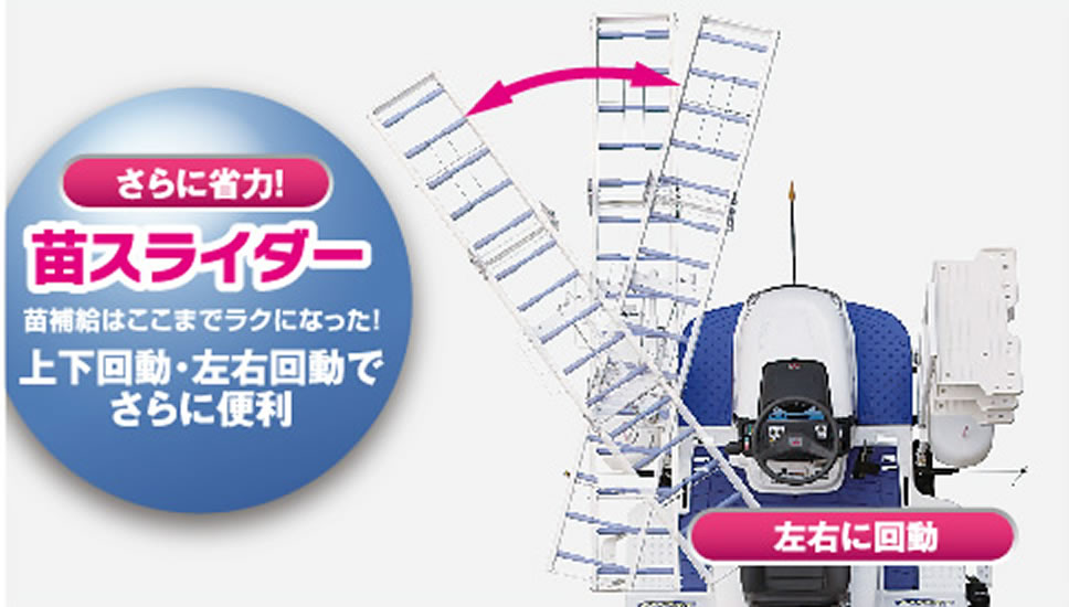 まくらっこの操作は電動式になり、調整も簡単。苗スライダーは上下左右に回動し、補助者・作業者共にますます使いやすくなりました。