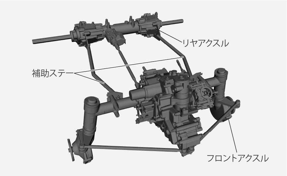 フロントアクスルとリヤアクスルをつなぐ補助ステーを装備することで強度をアップ。