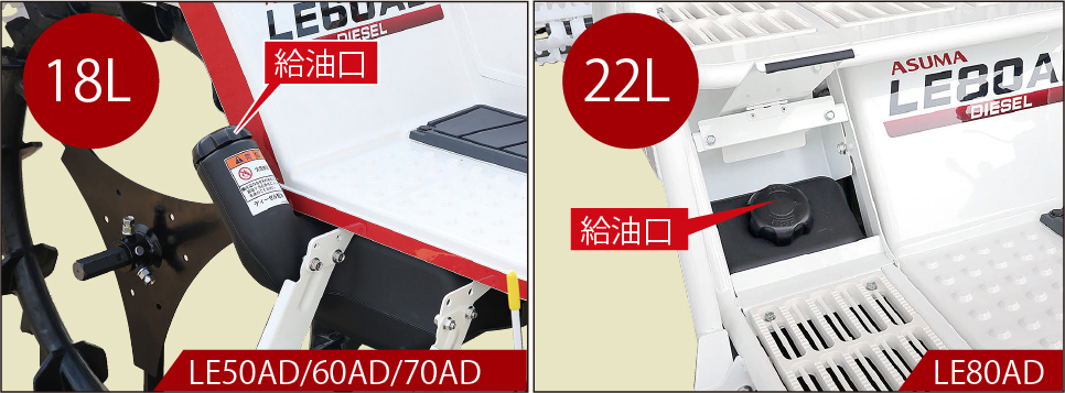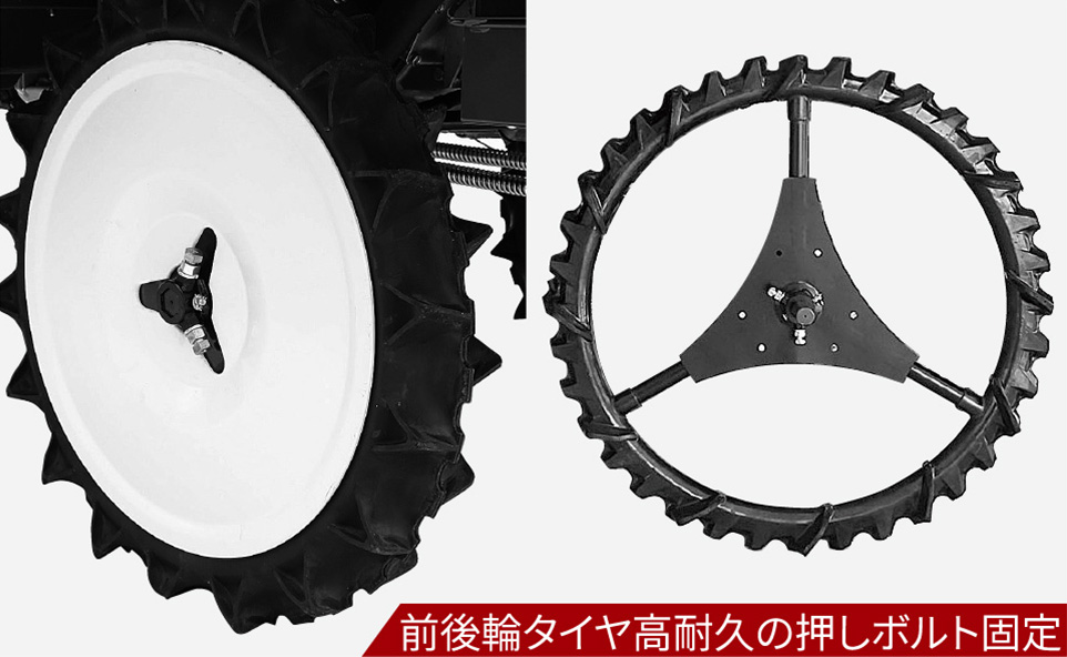 LE50AD、60AD、70ADは、前後輪共に高耐久の押しボルト固定タイヤで、安定した作業をサポートします。
