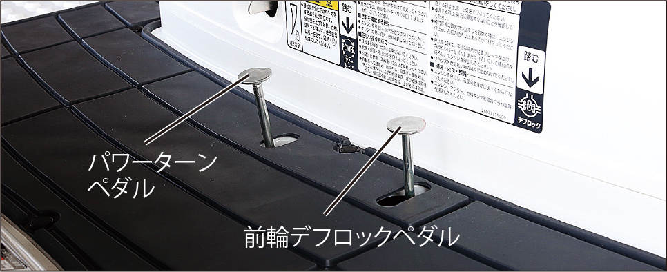 パワーターンペダルを旋回時に踏むと、強制的に四輪駆動となり駆動力がアップ。前輪タイヤがスリップした時は前輪デフロックペダルを踏めば駆動力がアップします。