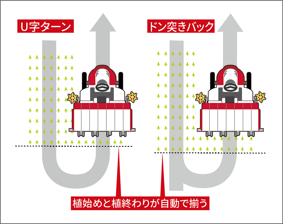 「U字ターン」「ドン突きバック」共に、植終りと植始めが揃う植付自動機能です。