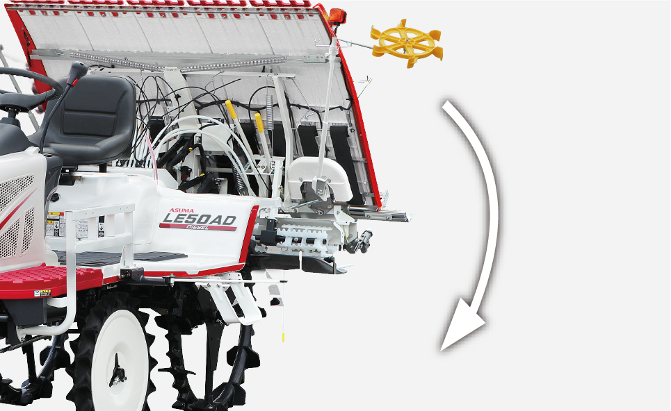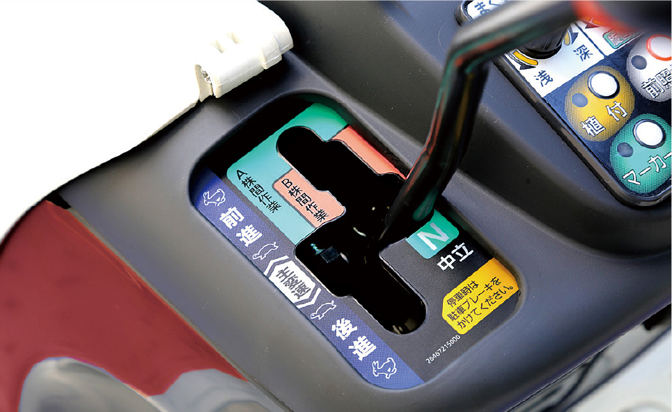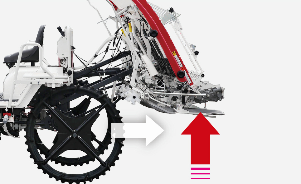 主変速レバーを「後進」にすると、植付部が自動で上昇し、上げ忘れによる破損の心配がなく作業効率も向上します。