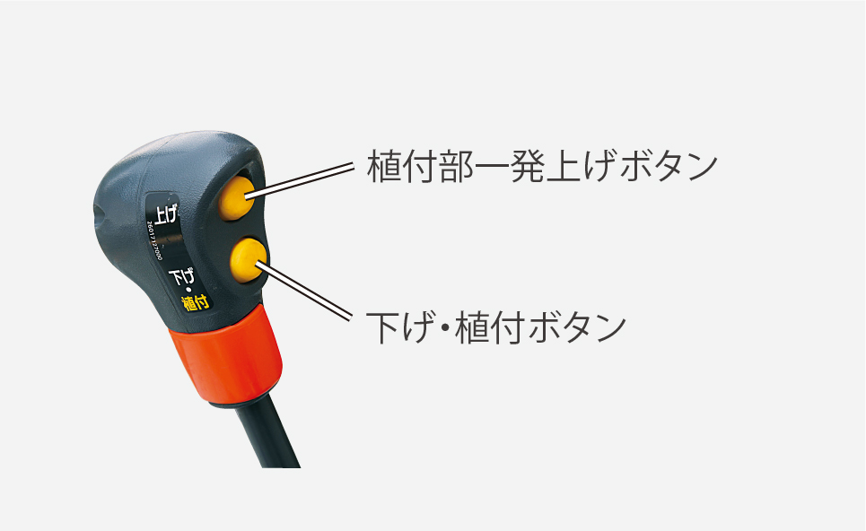 「植付部一発上げボタン」「下げ・植付ボタン」を主変速レバーに装備。ハンドル・主変速レバーから手を放さず前後進操作をしながら植付部を上下できます。