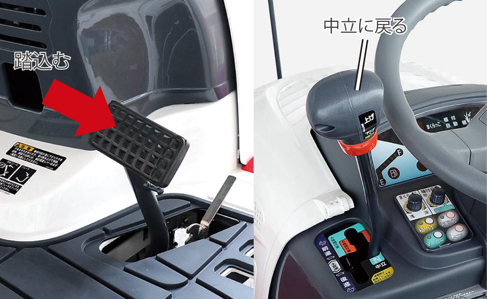 ブレーキペダルを踏むと主変速レバーが中立位置に戻り、レバーの戻し忘れによる急発進を防止。