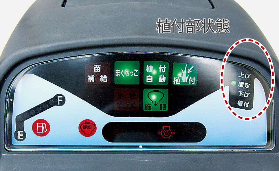 植付部の状態はモニタで確認可能。反射の影響を受けづらいLEDランプを採用しています。