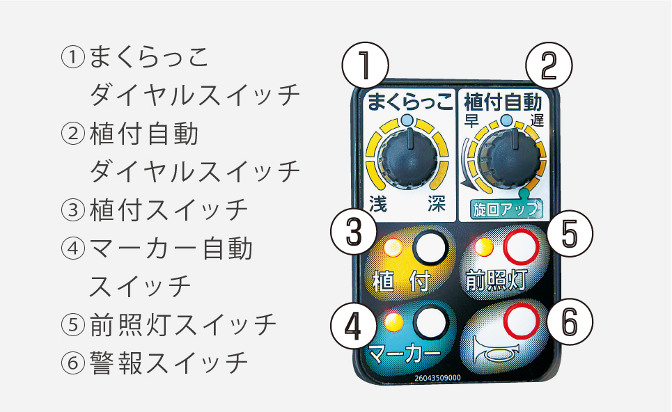植付部を下げたままで左右のマーカーを上げ下げでき、植付作業中は旋回するごとに自動で左右切替を行います。風車マーカー上昇時の土跳ねも軽減します。