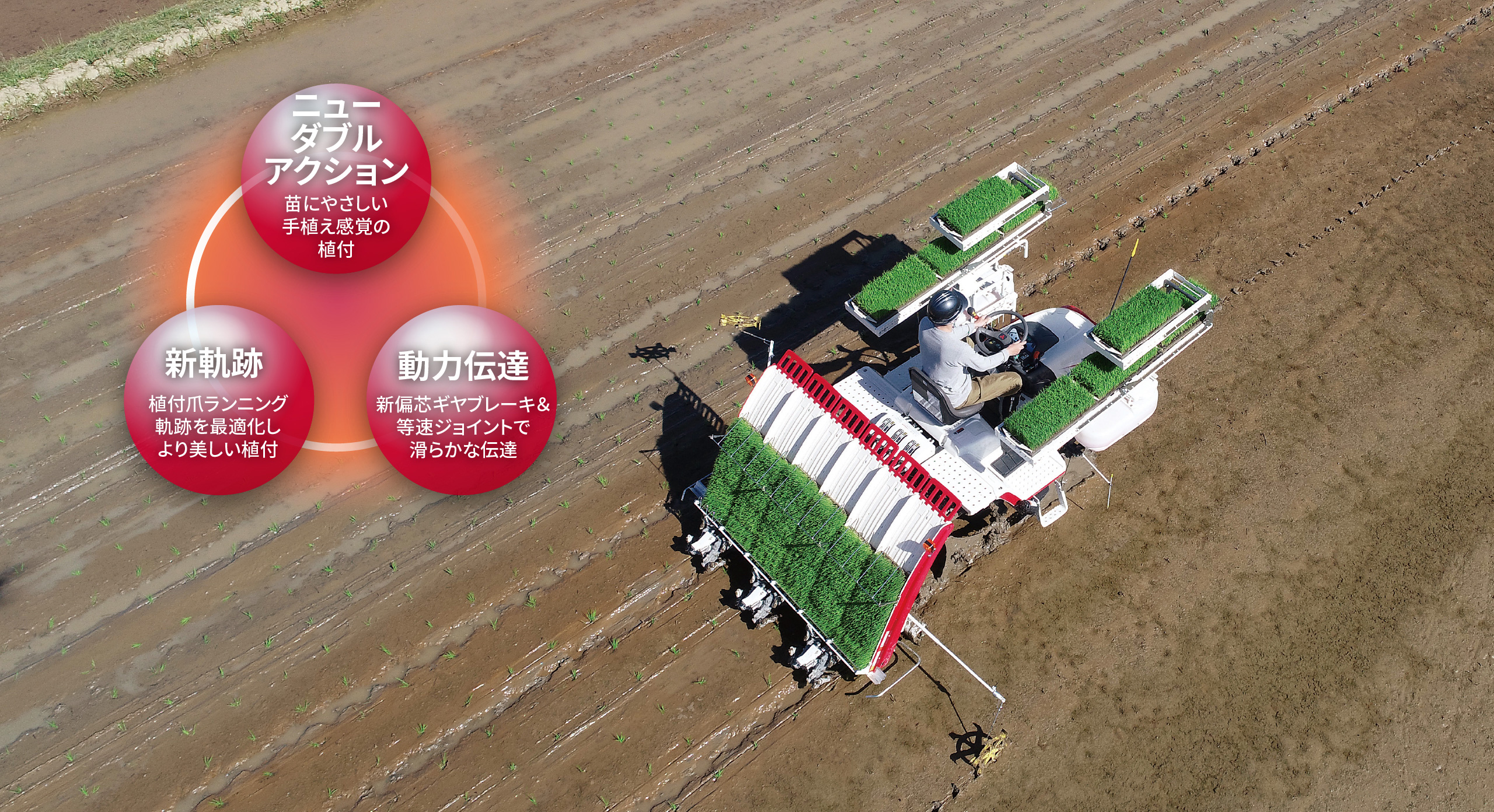 手植えのやさしさを再現するための「ニューダブルアクション」。的確な植付のための「植付爪ランニング軌跡最適化」。そしてこの2つの機能を確実に発揮するための「無駄のない、なめらかな動力伝達」。疎植や高速植付の時もきれいに仕上げたい、その強い願いにしっかり応えます。