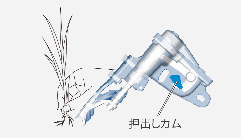 押出しカム式植付機構で苗に優しい手植え感覚を再現。