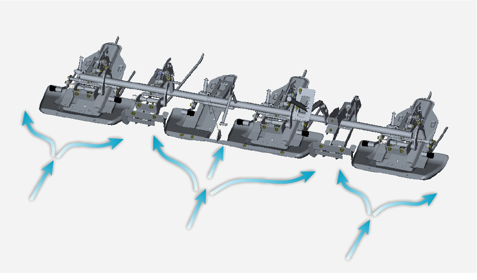 中央3条分をカバーする感知フロートは、大型化による感知性能の安定と、2分割構造によるスムーズな水流れにより、高速作業を可能にしました。
