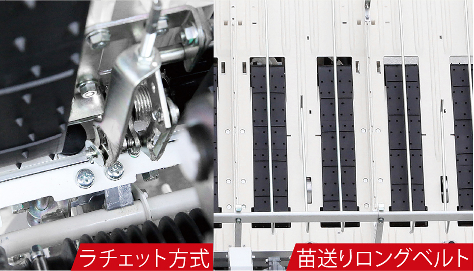 苗送りロングベルトに加えて苗の縦送りに高耐久のラチェット方式を採用。苗をしっかり送り、欠株を防止します。