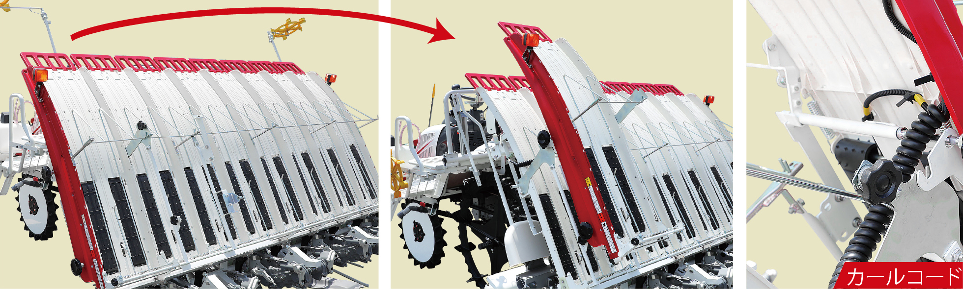 苗載台と植付部本体の接続構造はシンプルで、折りたたみが楽にできます。格納時や運搬時に簡単に折りたたみ作業ができ、便利です。