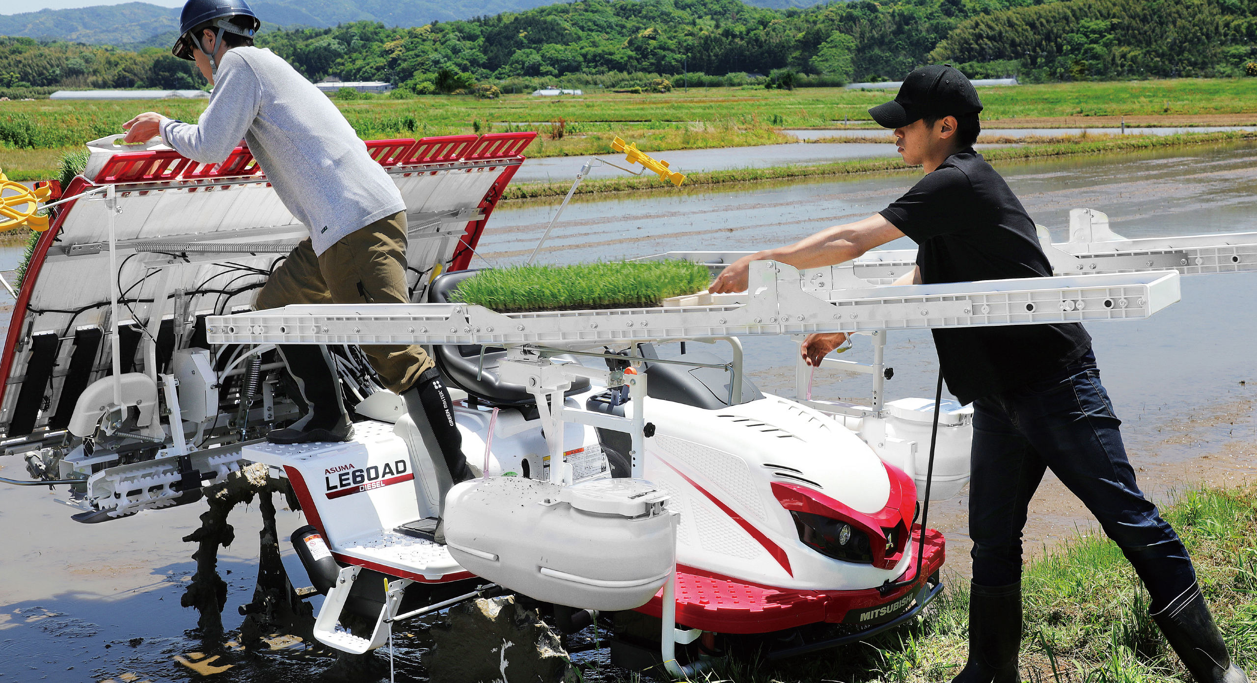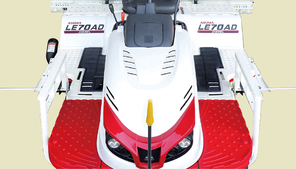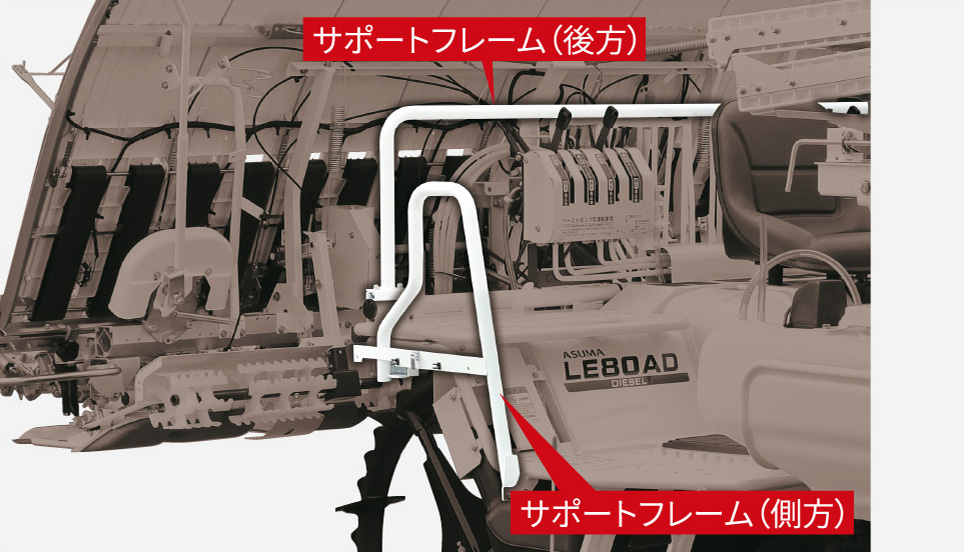 苗供給時に安心して作業できる、後方サポートフレーム。側方サポートフレームを使えば乗降も楽に行えます。