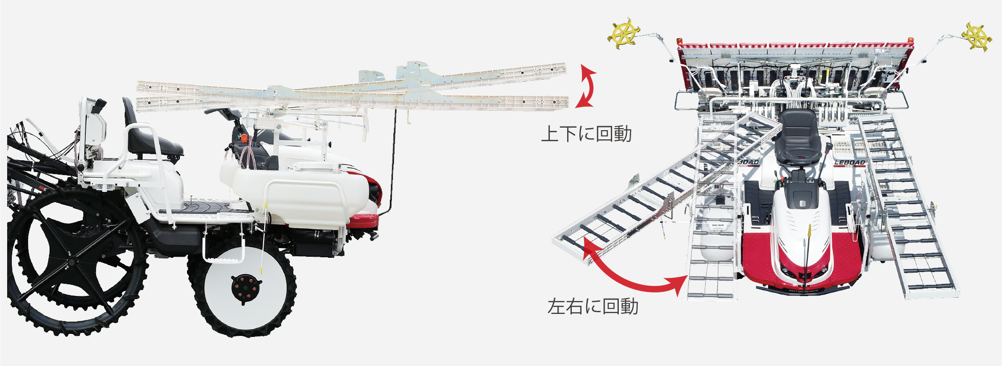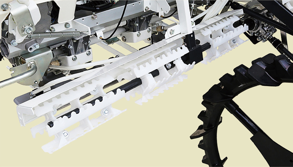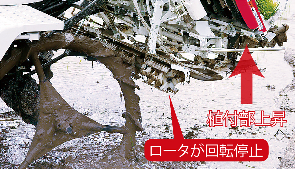 まくらっこ駆動中に植付部を上昇させると、ロータが自動停止。 下降させると自動で回転します。 旋回時のロータによる泥はねを防ぎ、駆動音も静かで快適です。