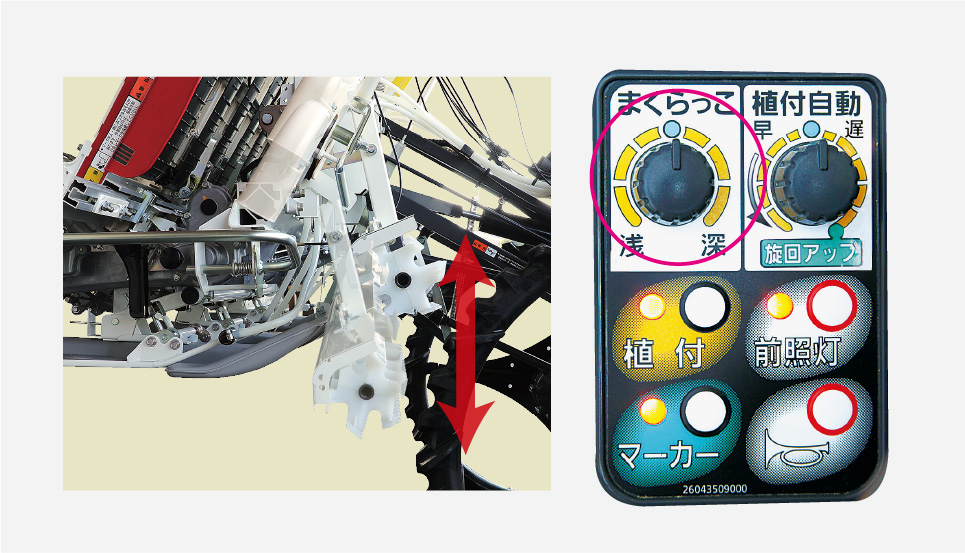 まくらっこの「入・切」は、運転席に座ったままダイヤルスイッチを押すだけ。植付深さに連動し、基本高さに自動でセットされます。 また、ほ場条件に合わせてダイヤル操作でまくらっこ高さの微調整ができます。