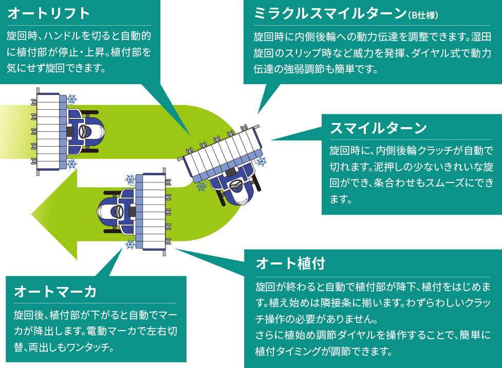 変形ほ場などオート植付を使わない時もラクに操作できます。