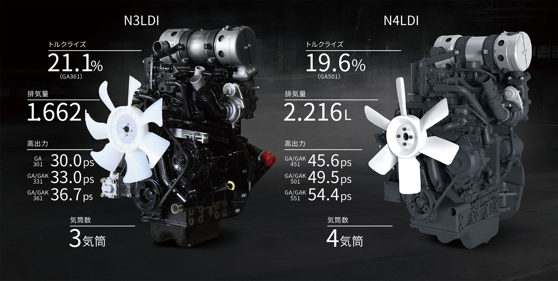 高トルクライズ、パワフルなディーゼルエンジンで重負荷作業をしっかりサポートします。