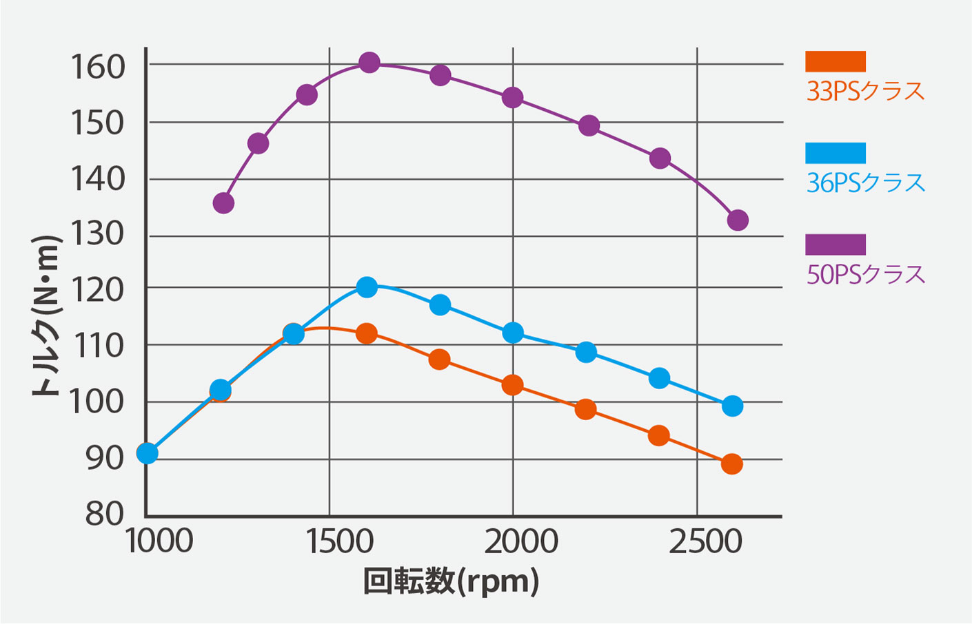 エンジン回転中域帯で高いトルク性能を発揮。粘り強いパワーで安定した作業が可能です。