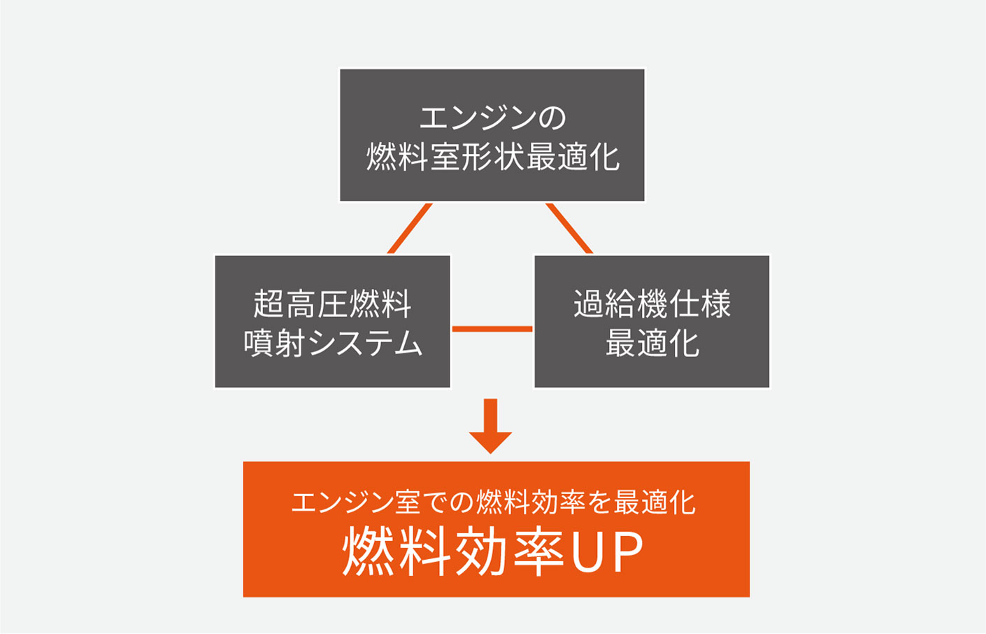 エンジンの燃焼室形状の最適化、超高圧燃料噴射システム、高度な燃料噴射制御、過給機仕様の最適化といった最新テクノロジーを融合。エンジン内での燃料効率が向上しました。