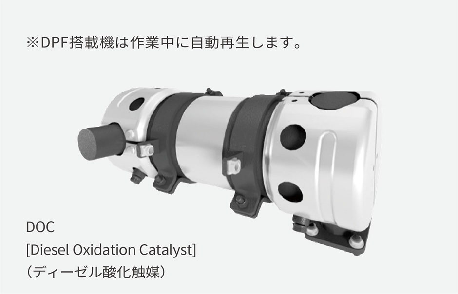 エンジン内の燃焼効率が向上。DPFを使わずDOCのみで排ガス規制に適合しました。自動再生時の出力低下の心配がなく、作業への影響がありません。
