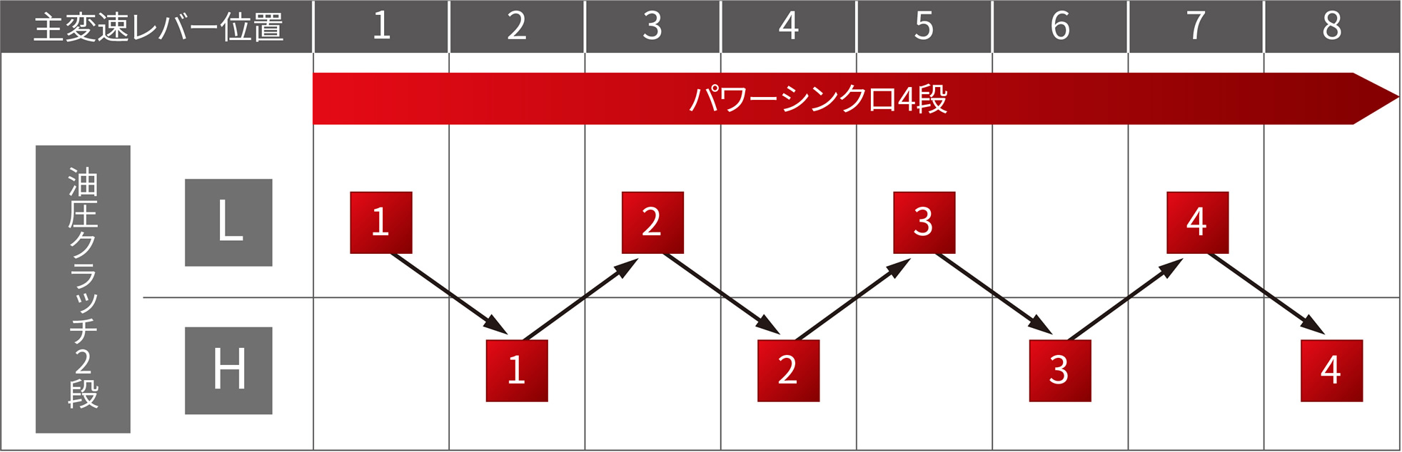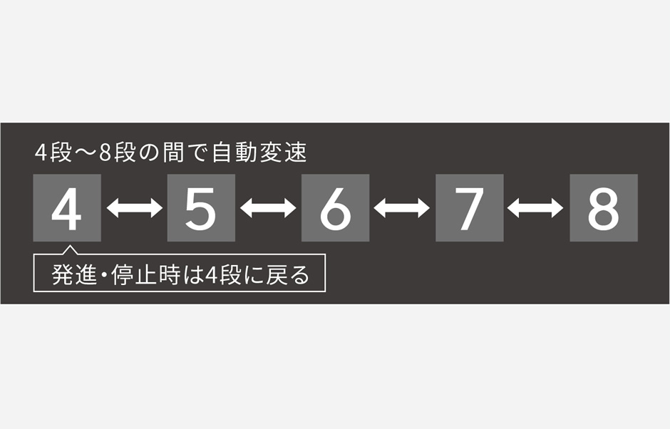 1段毎に切替を行い、4段のパワーシンクロと組み合わせることで、小気味よく変速し、