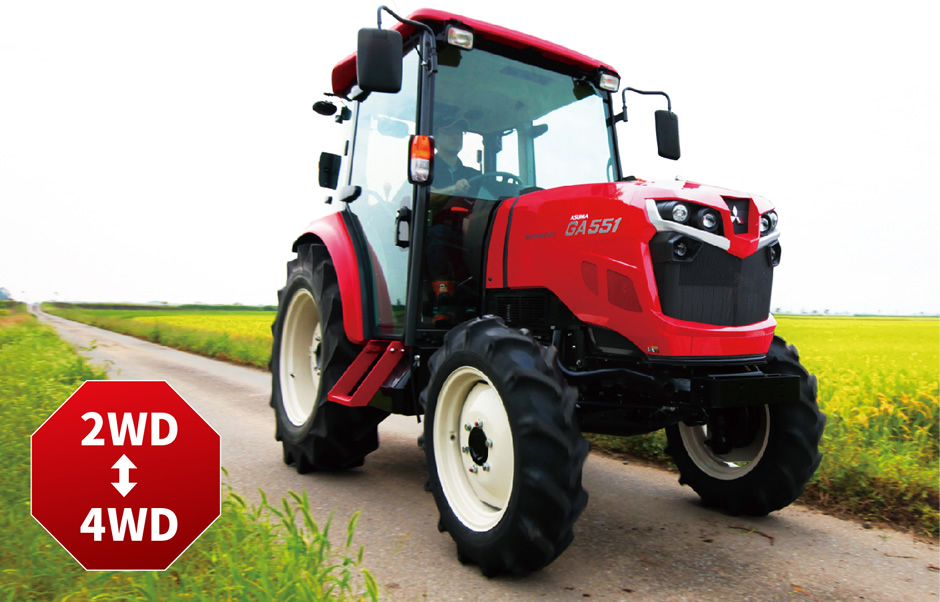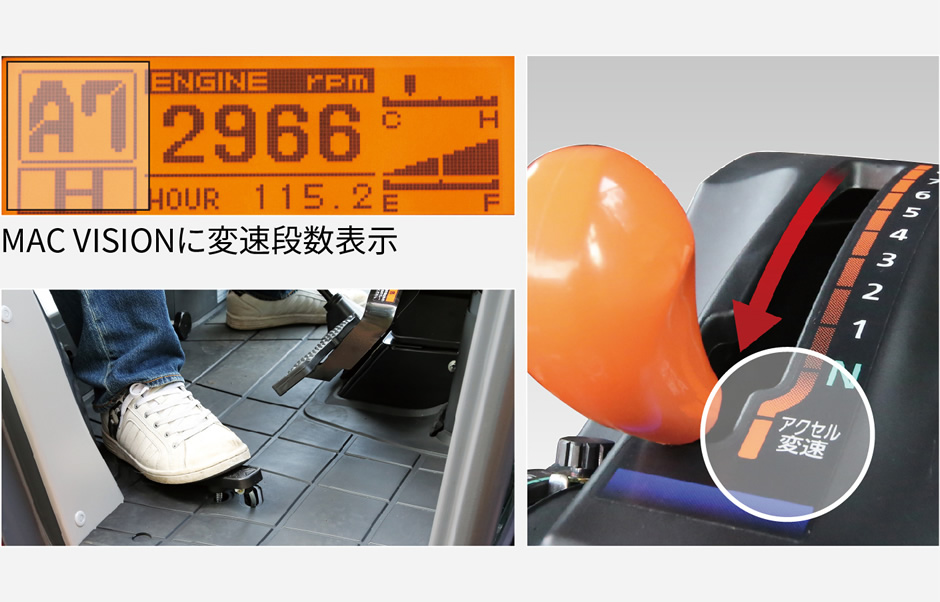 路上走行時、主変速レバーを「アクセル変速位置」に入れるとオートマチック感覚で、自動変速ができるので、スムーズな走行ができ移動時にストレスを感じさせません。