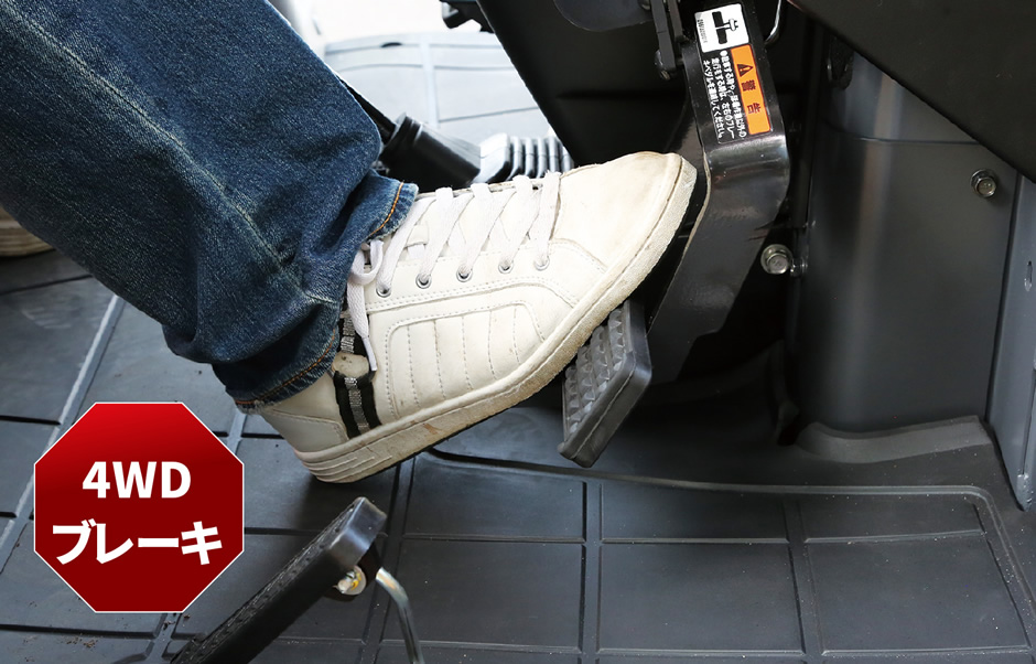 左右のブレーキが連結している状態でブレーキペダルを踏むと、自動的に4WDに切り替わり、安定した制動力が得られます。