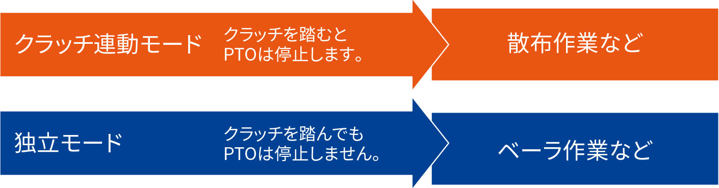 インデPTO機能を装備しており、作業に合わせてPTOの動作モードを簡単に切替できます。