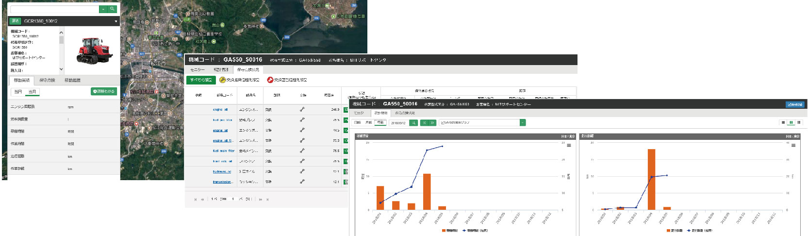 機械に搭載した通信機とGPSアンテナを利用し、無線通信を介して機械の稼働状況や機械の状態をMITサーバー上に蓄積します。その蓄積された情報をもとに、お客様の機械をサポートするシステムです。