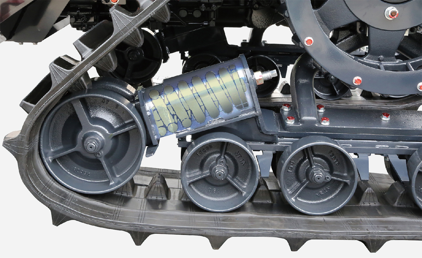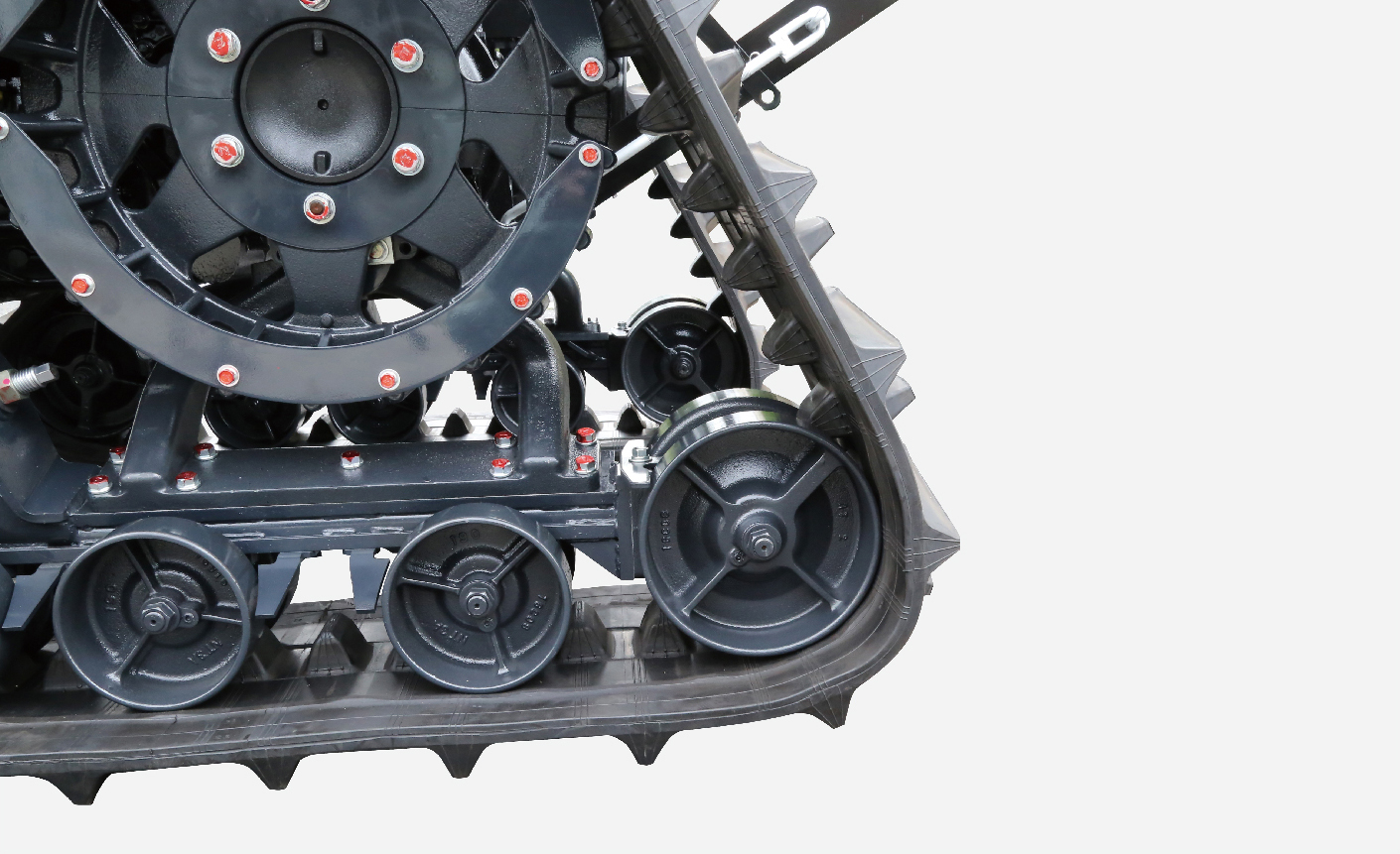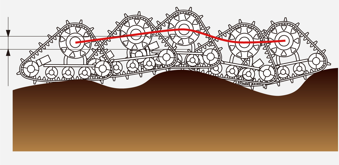 車軸より下に設定した揺動支点構造により、クローラをしっかりと地面に接地されるため、強力なけん引力を発揮します。また車軸より下方にすることで、車軸の上下動を抑え凹凸に影響されにくく、安定した走行が可能です。