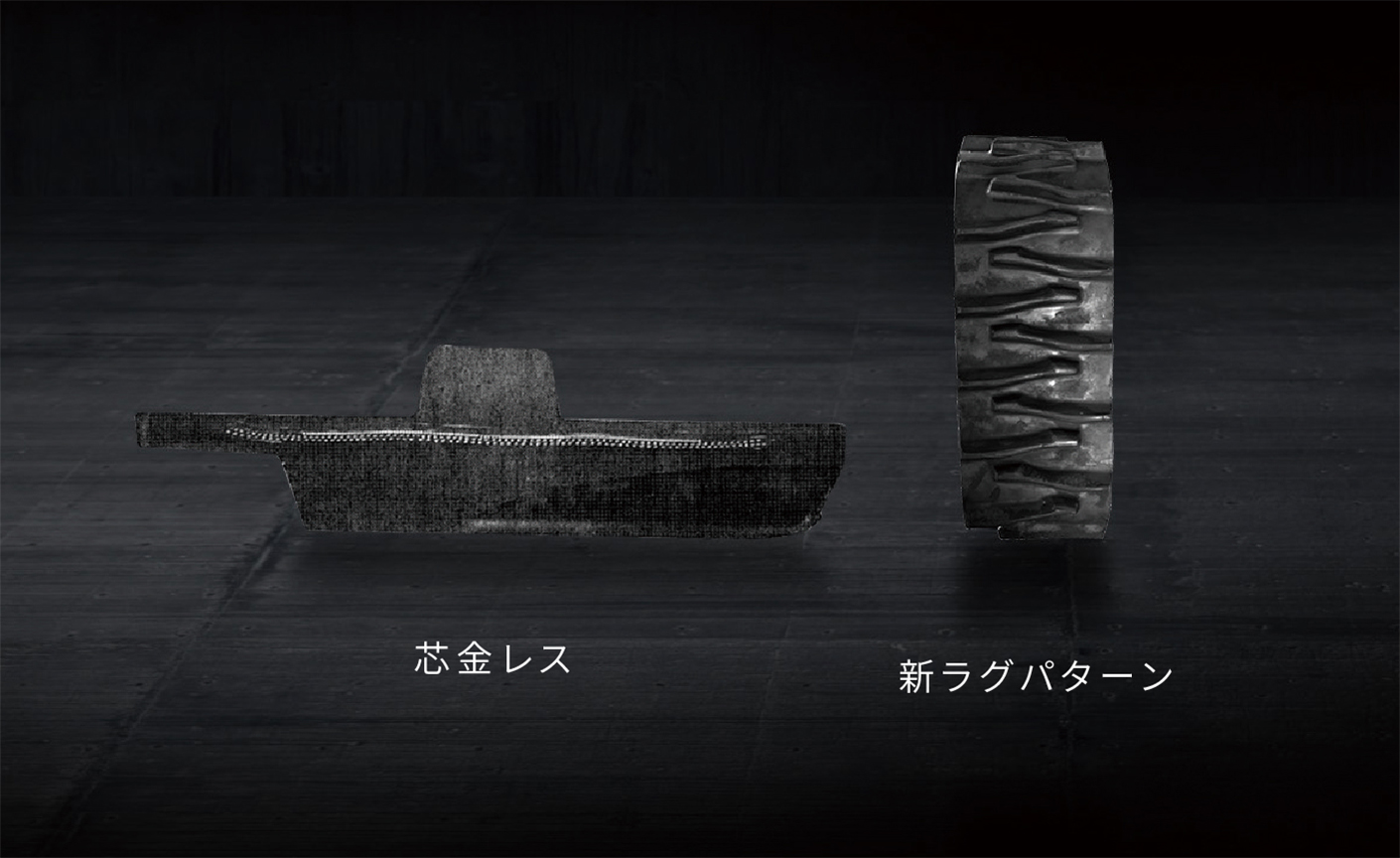 クローラの芯金をなくすことで振動を抑え、騒音も軽減。新ラグパターンの採用で泥離れもよく、乗り心地が向上しました。