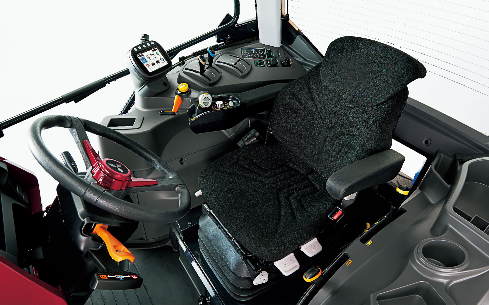 体格に合わせ、前後位置と角度を調節できます。細かくシート位置を調整できるエアサスシートと合わせ、楽な姿勢で作業できます。