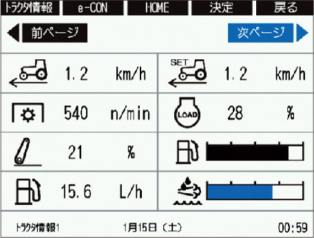車速 /走行距離/トラクタ設定車速/ABモード/エンジン回転速度/エンジン負荷率 / PTO回転速度 / 燃費/リフト位置 / トラクタ傾き/総燃料消費量 /アワーメーター/ 水温 / バッテリ電圧