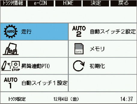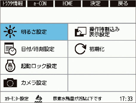 トラクタ情報 / e-CONTROLの設定 / トラクタ設定 / ディスプレイ設定 / レーザー設定(装備の場合) / フロントローダ設定(装備の場合) / カメラ機能(カメラオプション) / セキュリティ機能 / エラー表示