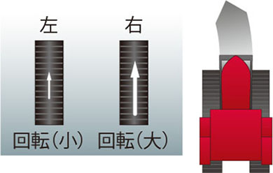 旋回時にも両クローラが駆動し、スムーズに旋回できます。また旋回時、直進時と同じパワーで駆動するため、なめらかに旋回できます。