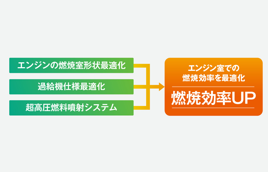 エンジンの燃焼室形状の最適化、超高圧燃料噴射システム、高度な燃料噴射制御、過給機仕様の最適化といった最新テクノロジーを融合し、エンジン内での燃焼効率を向上しました。
