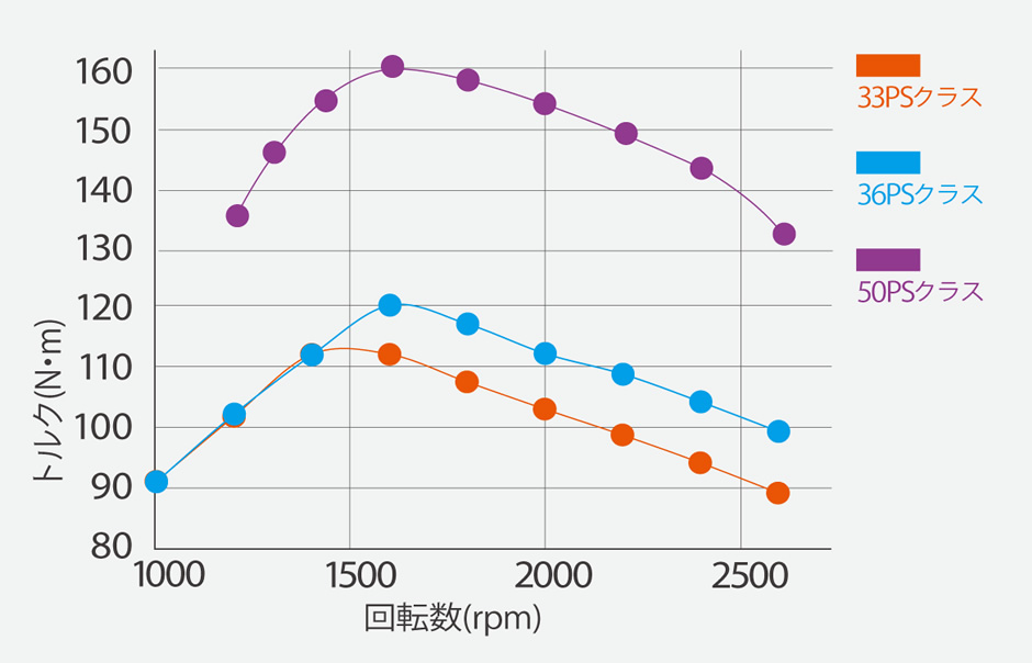 高トルクライズ、パワフルなディーゼルエンジンで重負荷作業をしっかりサポートします。