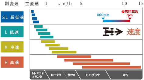 多彩な移動速度で様々な作業に広く対応。作業効率が向上します。2輪駆動・4輪駆動の切替はボタン式で走行中でも簡単に行えます。