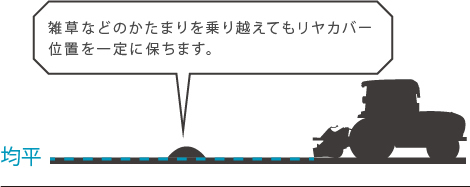 ジャイロセンサを搭載し、本機が傾くスピードに応じてロータリの傾くスピードも制御。枕地など凹凸の多いところでも高い均平性を保ちます。また傾斜感度の向上により、微細な角度変化にも反応でき、通常耕うん時のねじれ現象も抑えます。