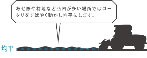 ほ場条件に合わせて、耕深制御内容が変化。畑など凹凸の少ない耕盤ではロータリの上下動を抑え、あぜ際や枕地など凸凹が多い場所では積極的にロータリを上げ下げします。