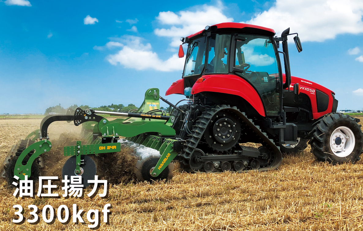 大油圧揚力で、高能率作業ができる大型インプルメントの装着が可能です。