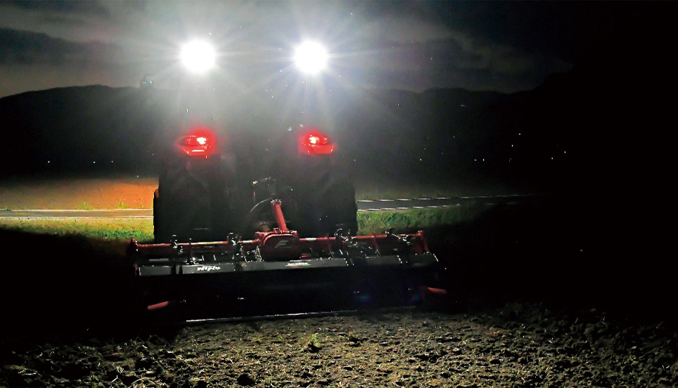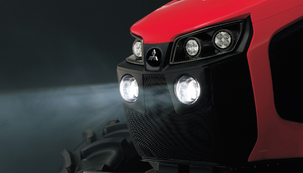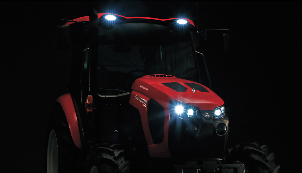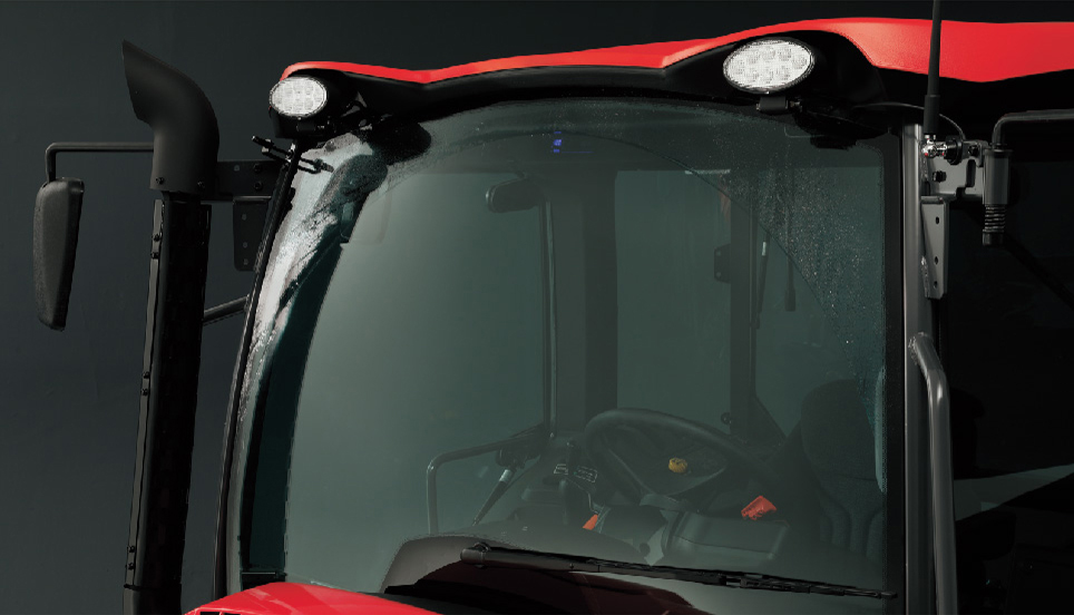8灯のLED作業灯を標準装備。ボンネット前方に4灯、ルーフ前・後に各2灯ずつ装備しています。(オプションで、前方2灯と後方1灯の追加装備が可能)夜間での視認性を向上させ、安心して作業が行えます。また、キーオフした後でも一定時間フットライトと作業灯を点灯するように設定できるので、納屋等の暗所でも安心して行動できます。