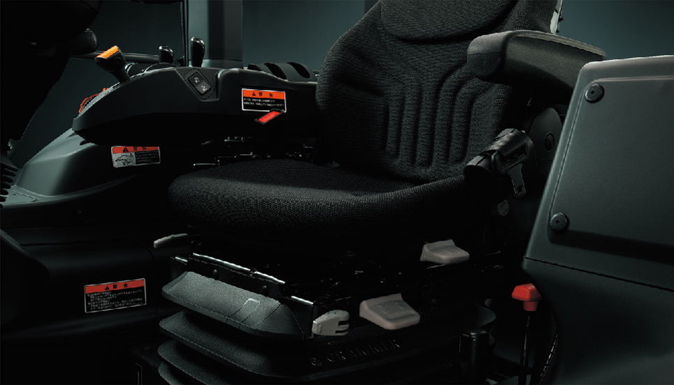 [スイべル機能付]クッション性の高いエアーサスペンションシートは、後方作業を確認しやすいスイベル機構を装備し、長時間作業も快適。小物入れネット付きです。
